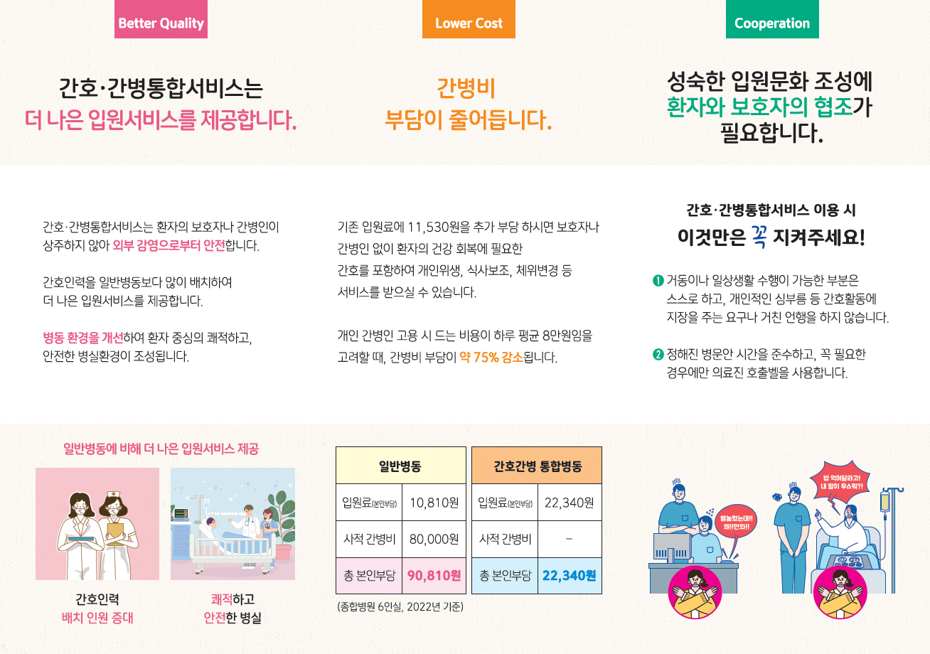 병실료 수가 : 일반 병실과는 별도의 간호 간병 통합서비스 병동 병실료 수가가 적용됩니다. 이 수가는 일반 병실료에 간병 서비스 비용이 포함된 형태로 책정됩니다. 수가가 높다고 오해할 수 있으나, 기존의 간병인 비용을 고려하면 훨씬 저렴한 구조입니다.
