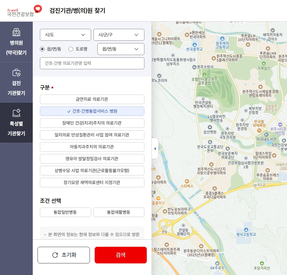 병원 유형 선택 : 상급종합병원, 종합병원, 병원 등 원하는 의료기관 종별을 선택할 수 있습니다. 특정 규모 이상의 병원을 선호한다면 이 옵션을 활용하세요.