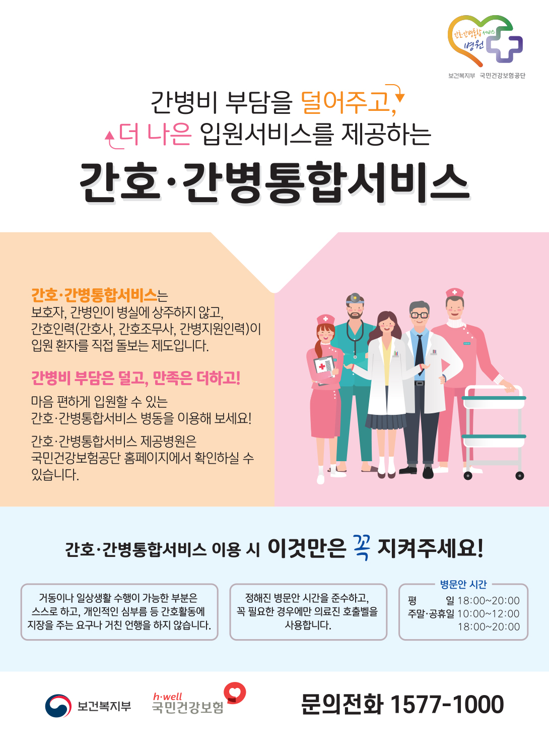 간호 간병 통합서비스 : 병원 내 전문 인력이 간병을 담당하며, 건보 적용되어 본인부담금이 대폭 줄어듭니다. 숙련된 의료 인력이 체계적인 간병 서비스를 제공하므로 의료 질 향상에도 기여합니다. 병실 환경도 쾌적하게 유지되어 환자의 회복에 긍정적인 영향을 미칩니다.