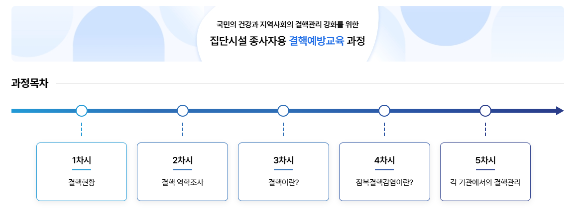 대한결핵협회 결핵예방교육센터에서 제공하는 집단시설 종사자 결핵예방교육은 결핵에 대한 기본적인 이해부터 실제 예방 수칙까지 포괄적으로 다룹니다. 2025년 교육 과정은 최신 연구 결과와 정책을 반영하여 구성되었으며, 총 5개 차시로 구성되어 있습니다.