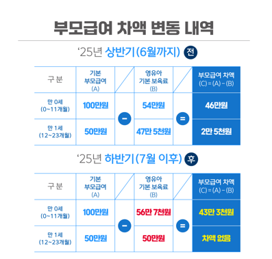 2025년 3월 1일에 태어난 아이는 2025년 3월부터 2026년 2월까지 만 0세 기준의 부모급여(100만 원)를 받게 됩니다. 그리고 2026년 3월부터는 만 1세 기준의 부모급여(50만 원)를 받게 되는 것입니다.