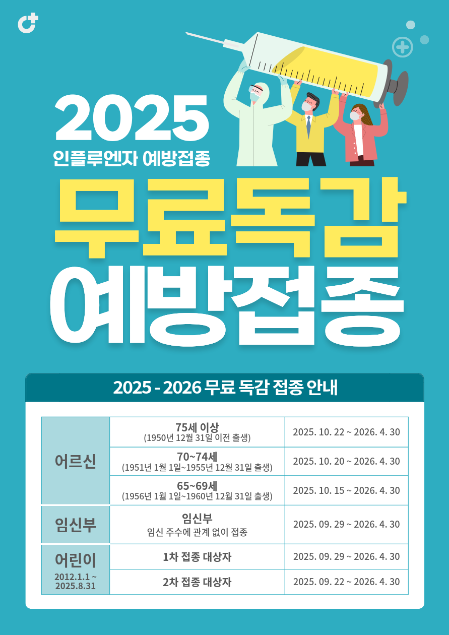 질병관리청은 2025년 9월 22일부터 2026년 4월 30일까지 2025-2026절기 인플루엔자 국가예방접종을 시행합니다.