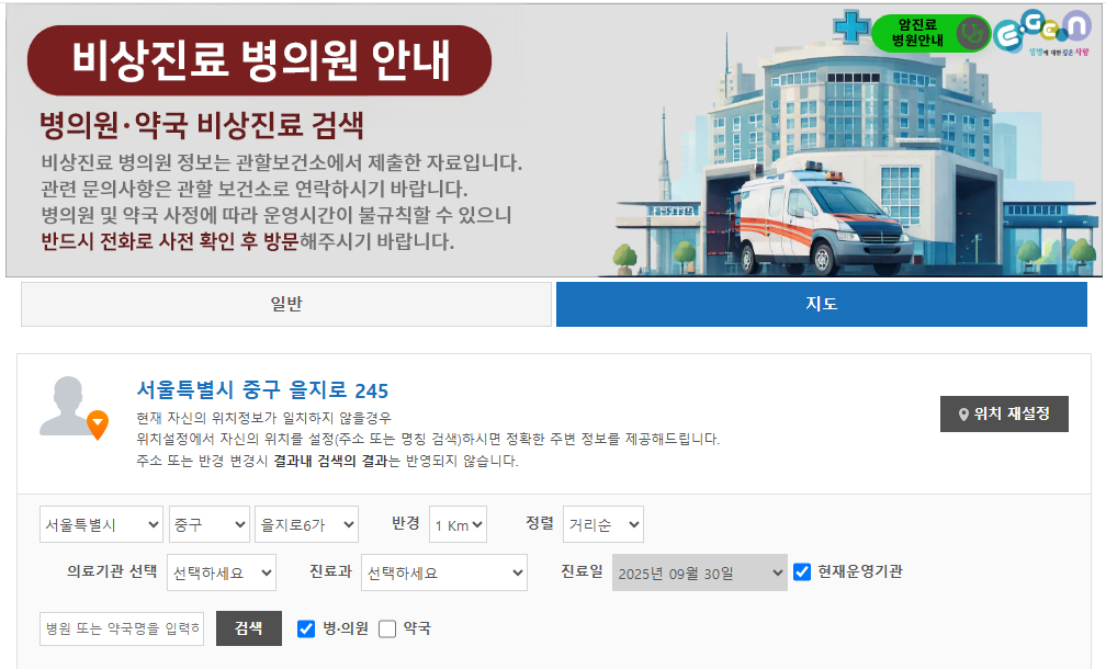 응급의료포털 E-Gen (웹/앱)을 통해 실시간으로 2025년 10월 연휴에 운영하는 병의원과 약국을 조회하고, 위치와 운영 시간을 파악합니다. (가장 정확한 공공 데이터)