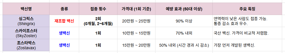 ■ 대상포진 예방 백신 3종 비교 및 가격대 (2025년 기준)