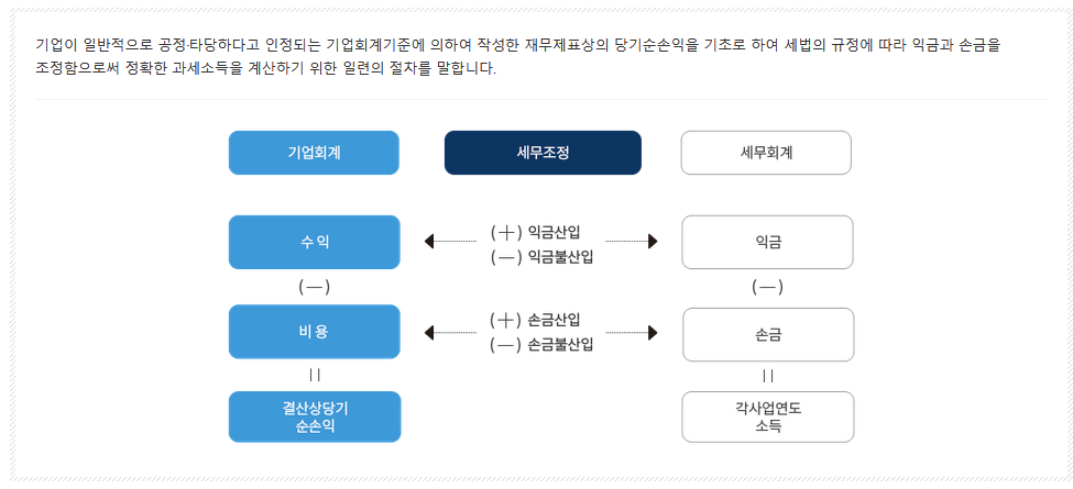 회계상 당기순이익에서 세무조정 과정을 거쳐야 비로소 세금을 매기는 기준 금액이 나옵니다.